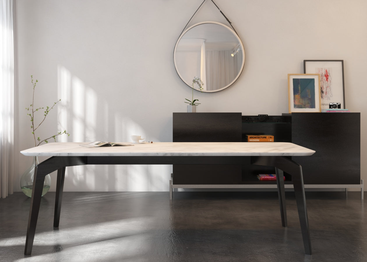 Keçi Yemek Masası İris serisi, yere hafif bir açıyla inen köşeli ahşap ayakları ile ahşabın doğallığını ve sıcaklığını ön plana çıkarıyor. Keçi Yemek Masası Teknik Özellikleri